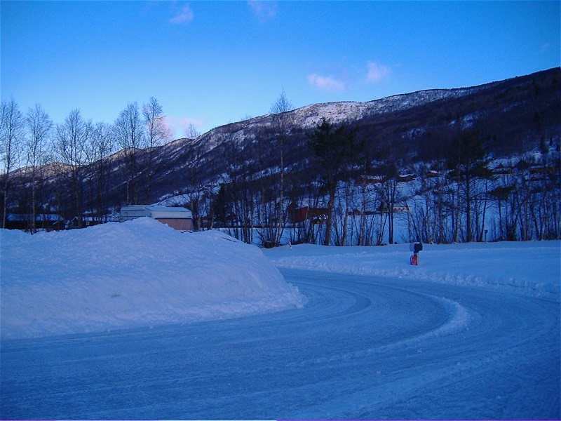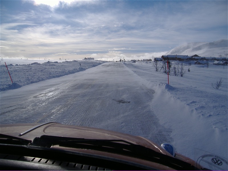 Bei Tageslicht und starken Schneeverwehungen fiel uns auf, dass wir wohl doch über drei Bergpässe gefahren sein müssen bei der Hinfahrt. Ab jetzt weiß ich, warum die Norweger an Trolle glauben. So nachts draußen im Dunkeln um 23:00 Uhr und weiße Landstraßen kam uns die Gegend schon seltsam vor. Wir kamen gut voran, wenn der Käfer uns nicht im Stich lässt, wird es sicherlich eine gute Etappe; weit gefehlt.